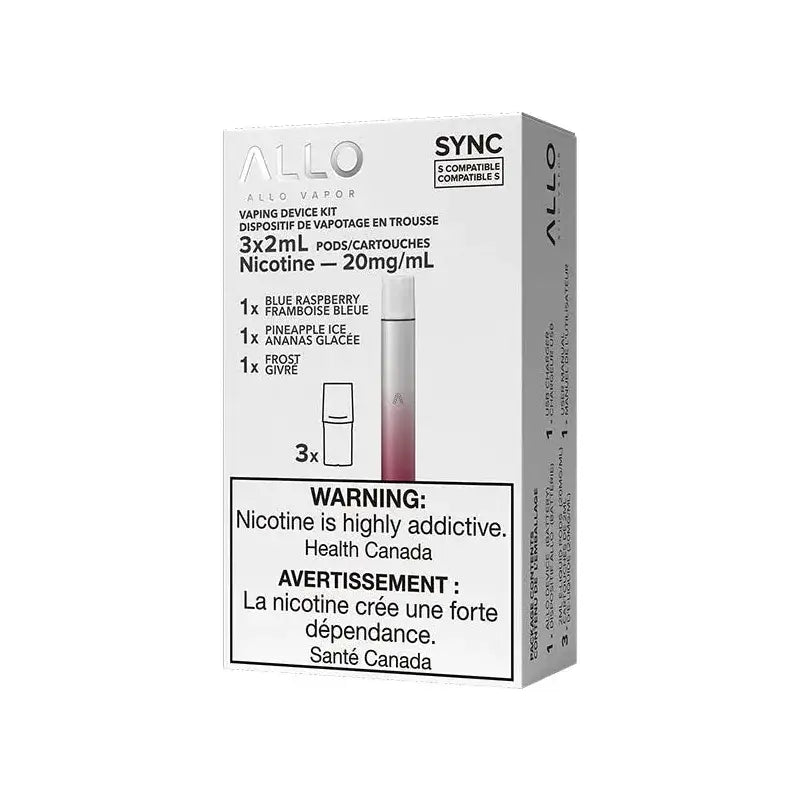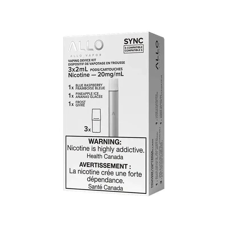 The ALLO Sync Starter Kit includes the ALLO Sync device and 3 prefilled pods to get you started. Features STLTH Compatible pod technology, mesh coils, and quick USB-C charging.